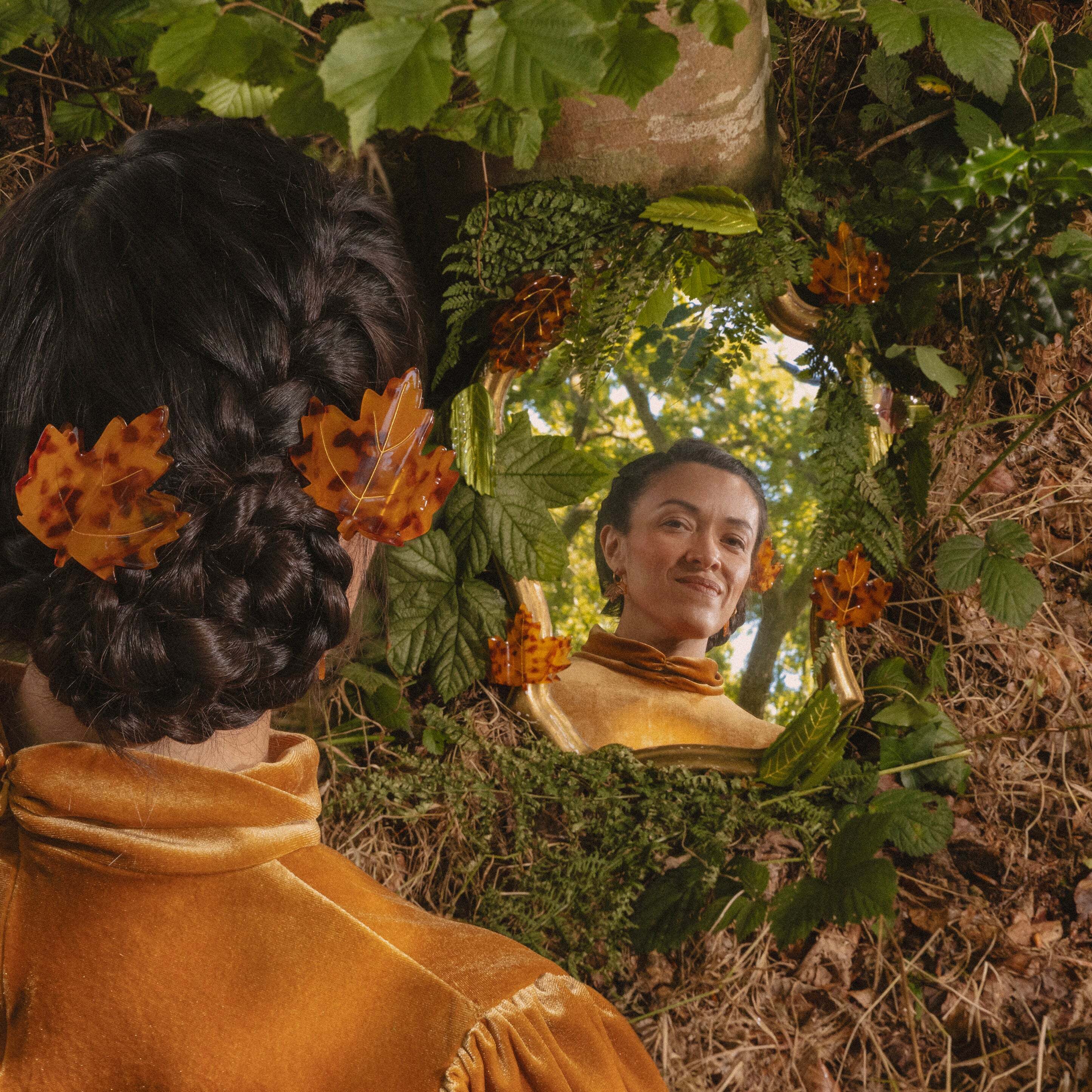 ころんと広がるメープルリーフのシルエットが印象的な、あたたかみたっぷりのヘアクロウ。