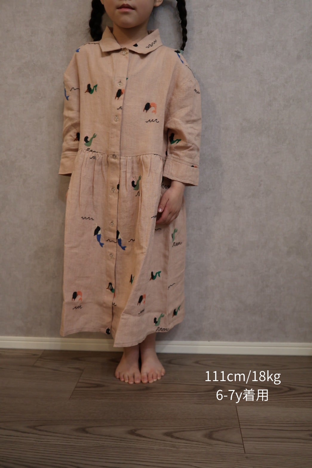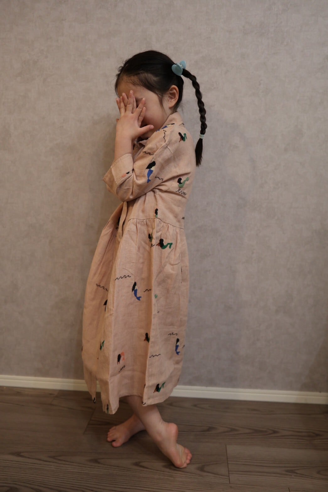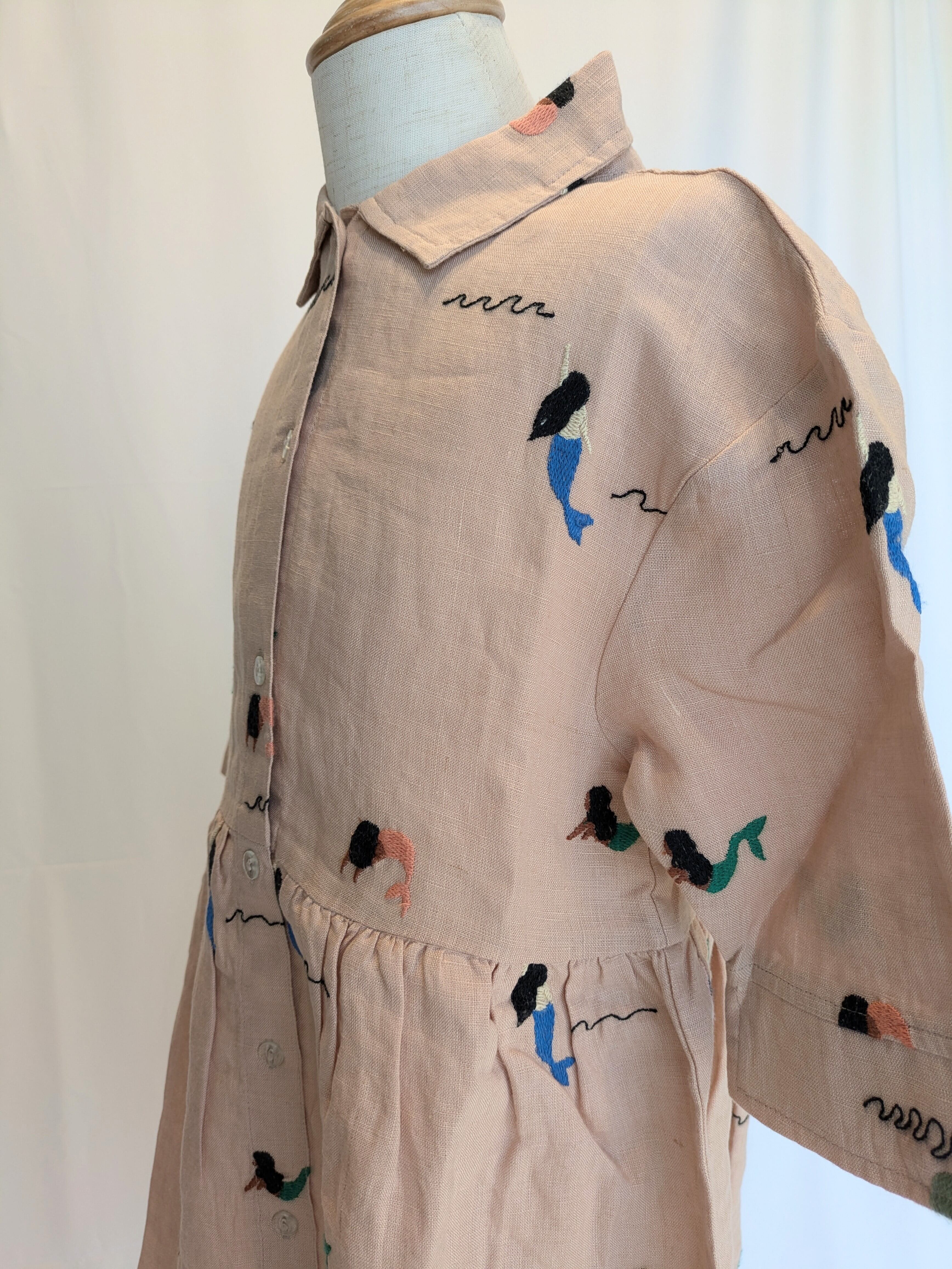 ダスティピンクのやわらかな色合いに、小さなマーメイドたちの刺繍が全体に散りばめられ、物語のワンシーンのような一着です。
