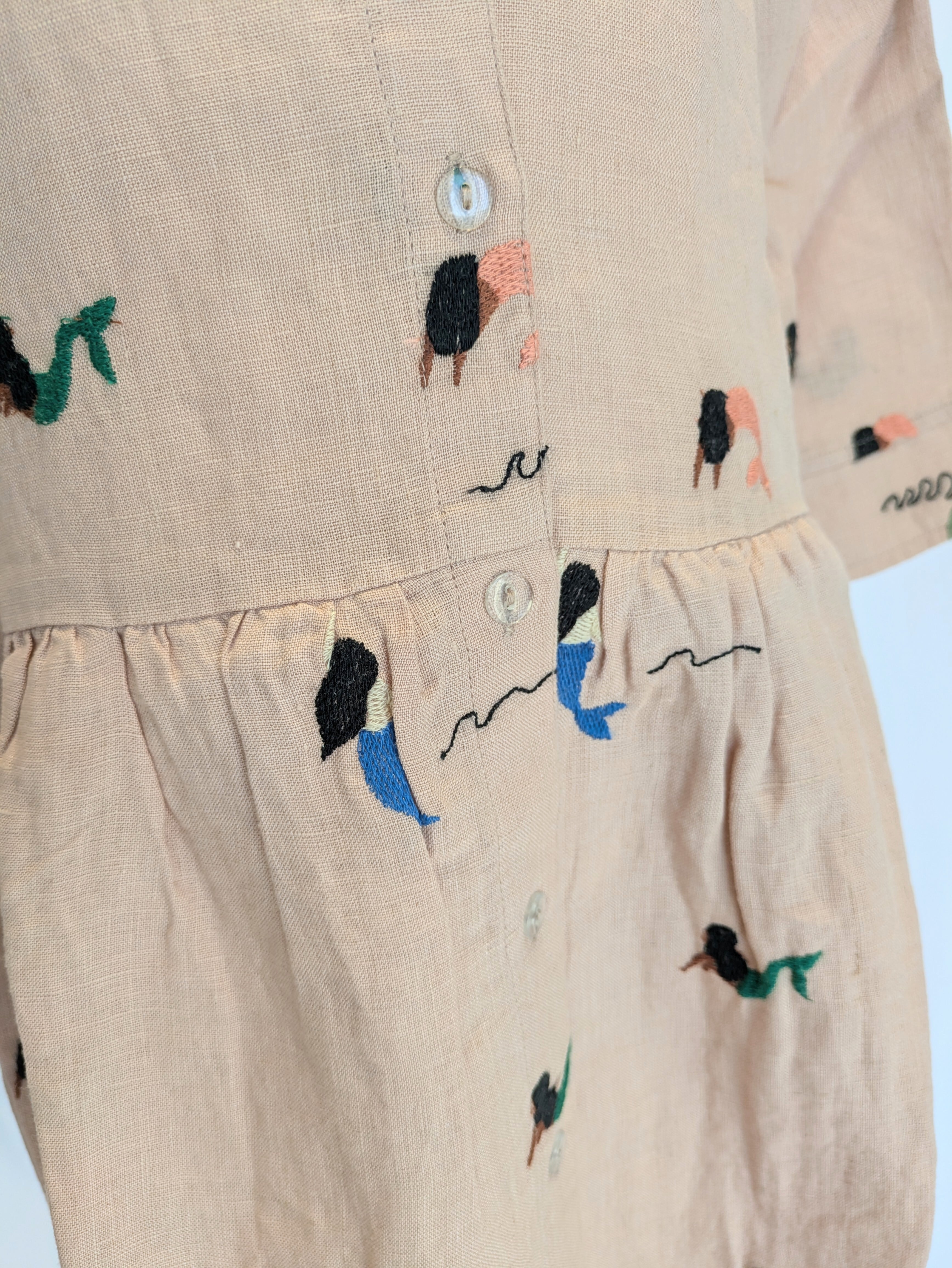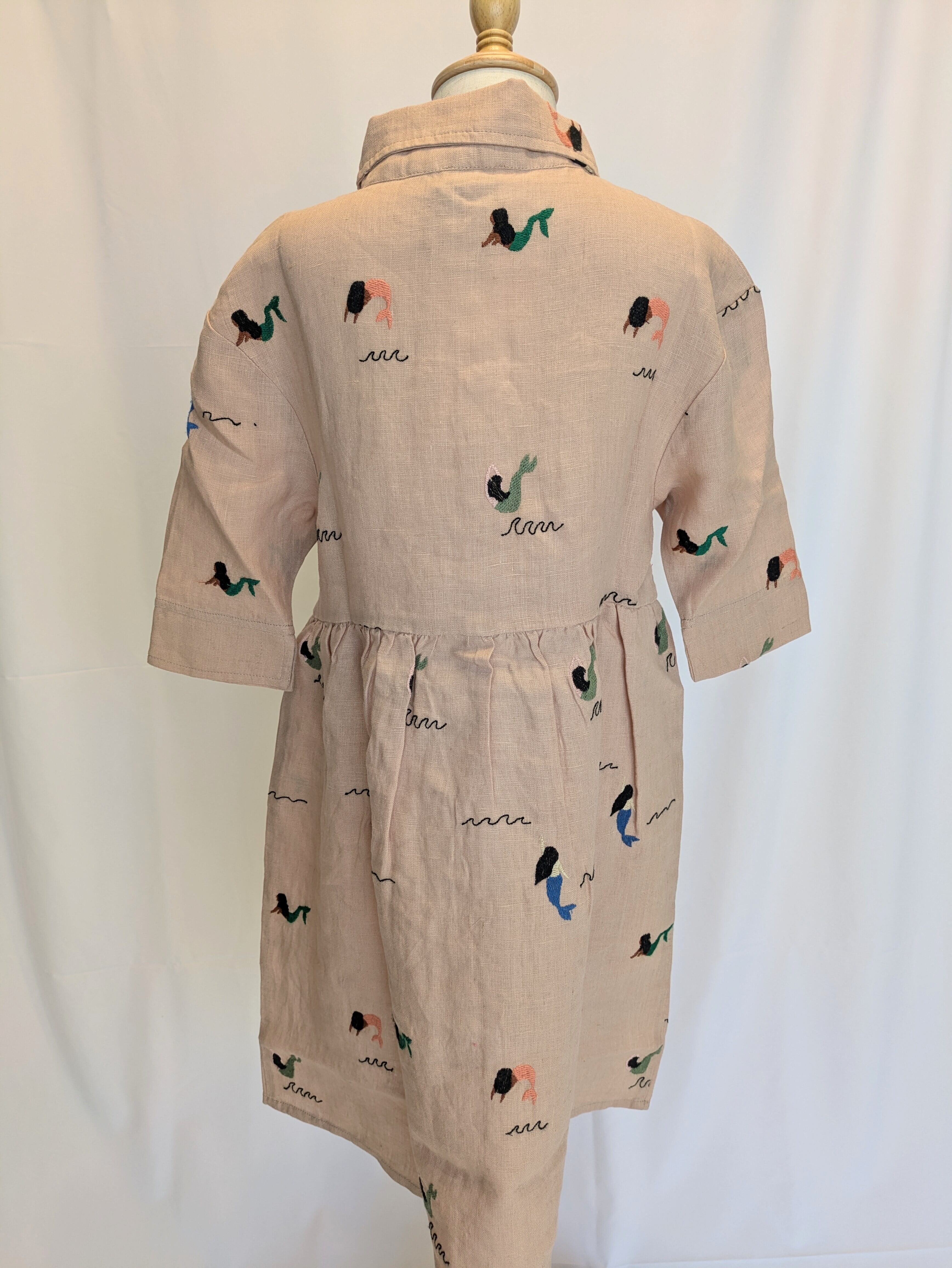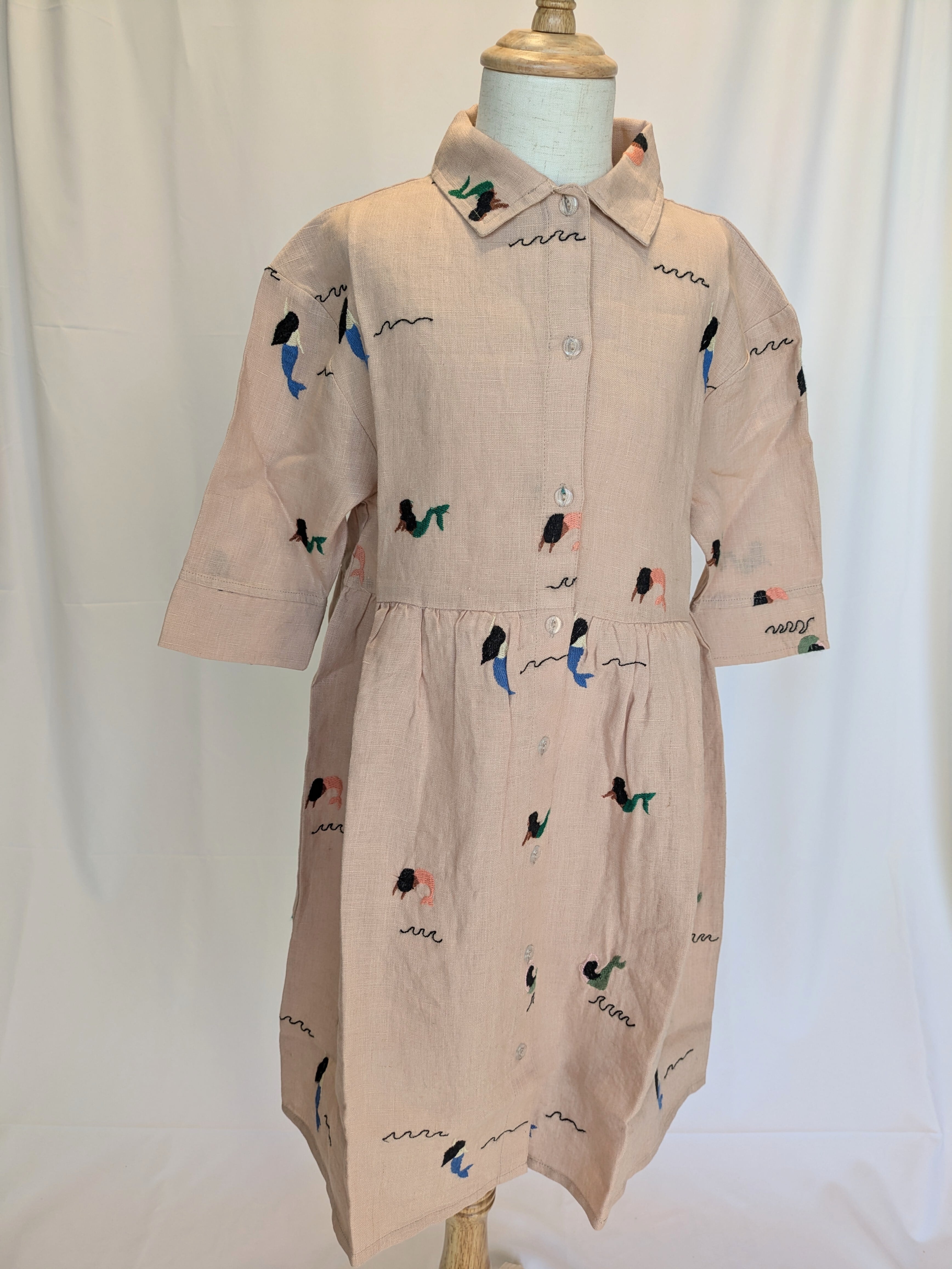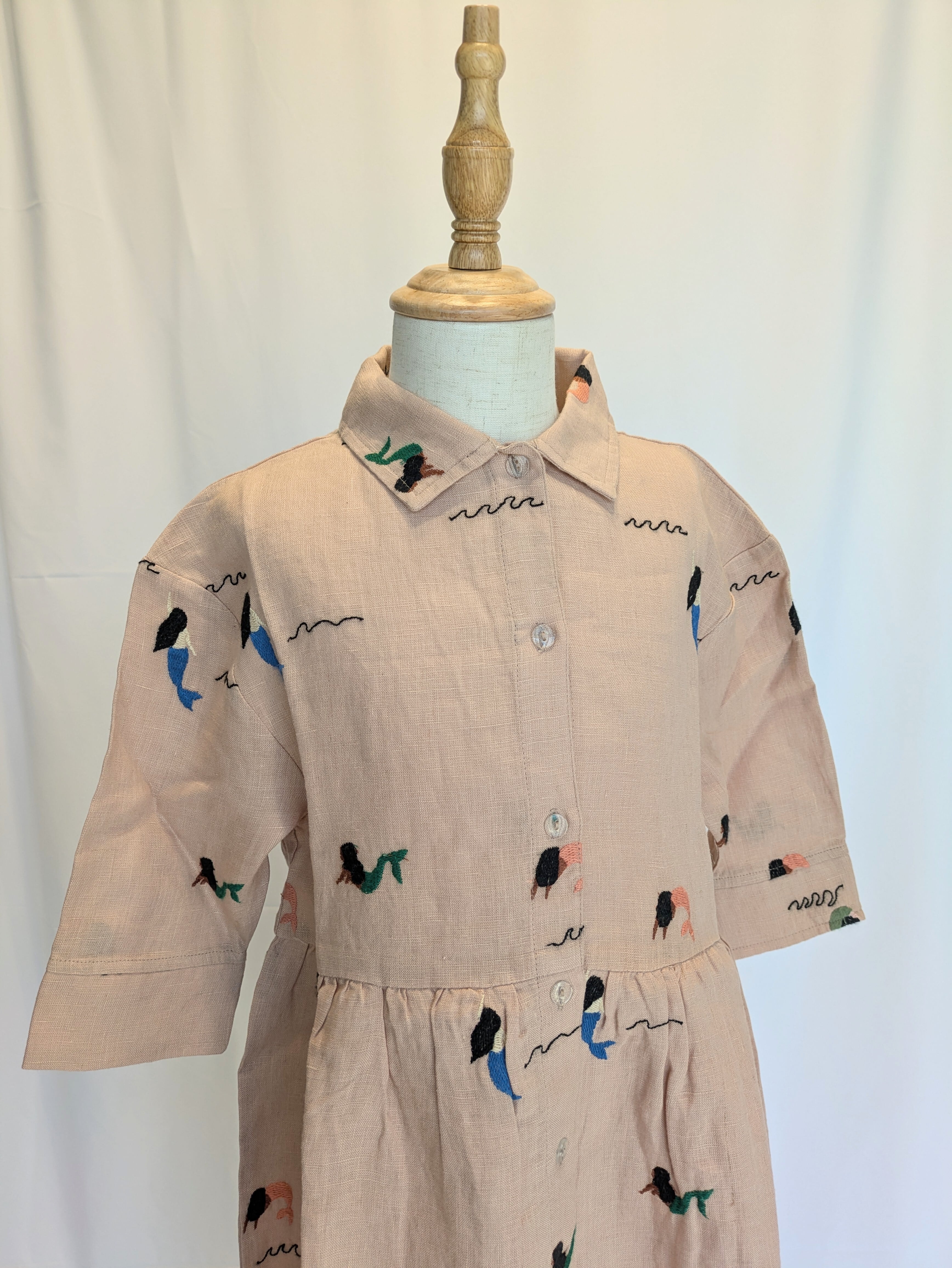 ダスティピンクのやわらかな色合いに、小さなマーメイドたちの刺繍が全体に散りばめられ、物語のワンシーンのような一着です。