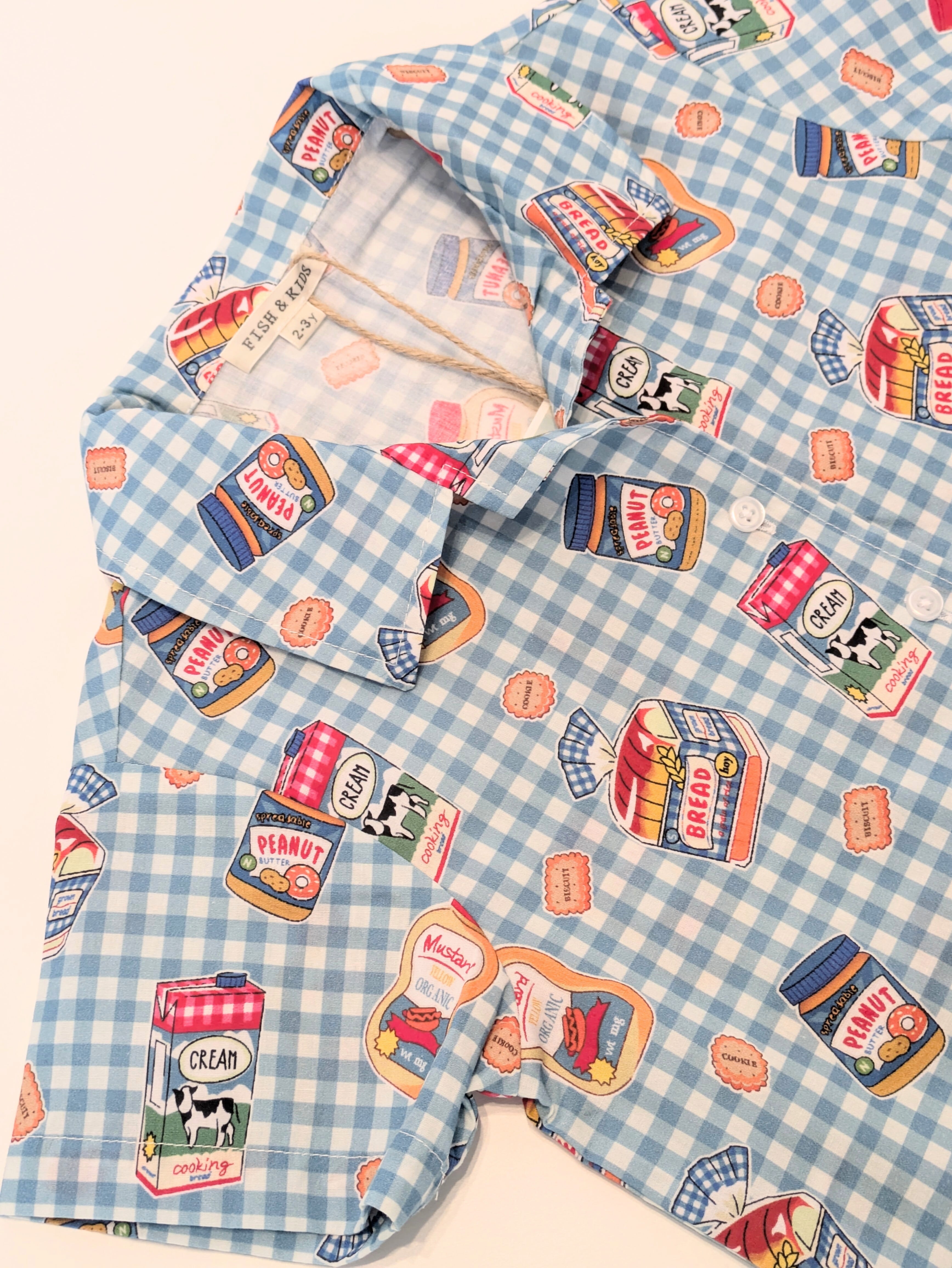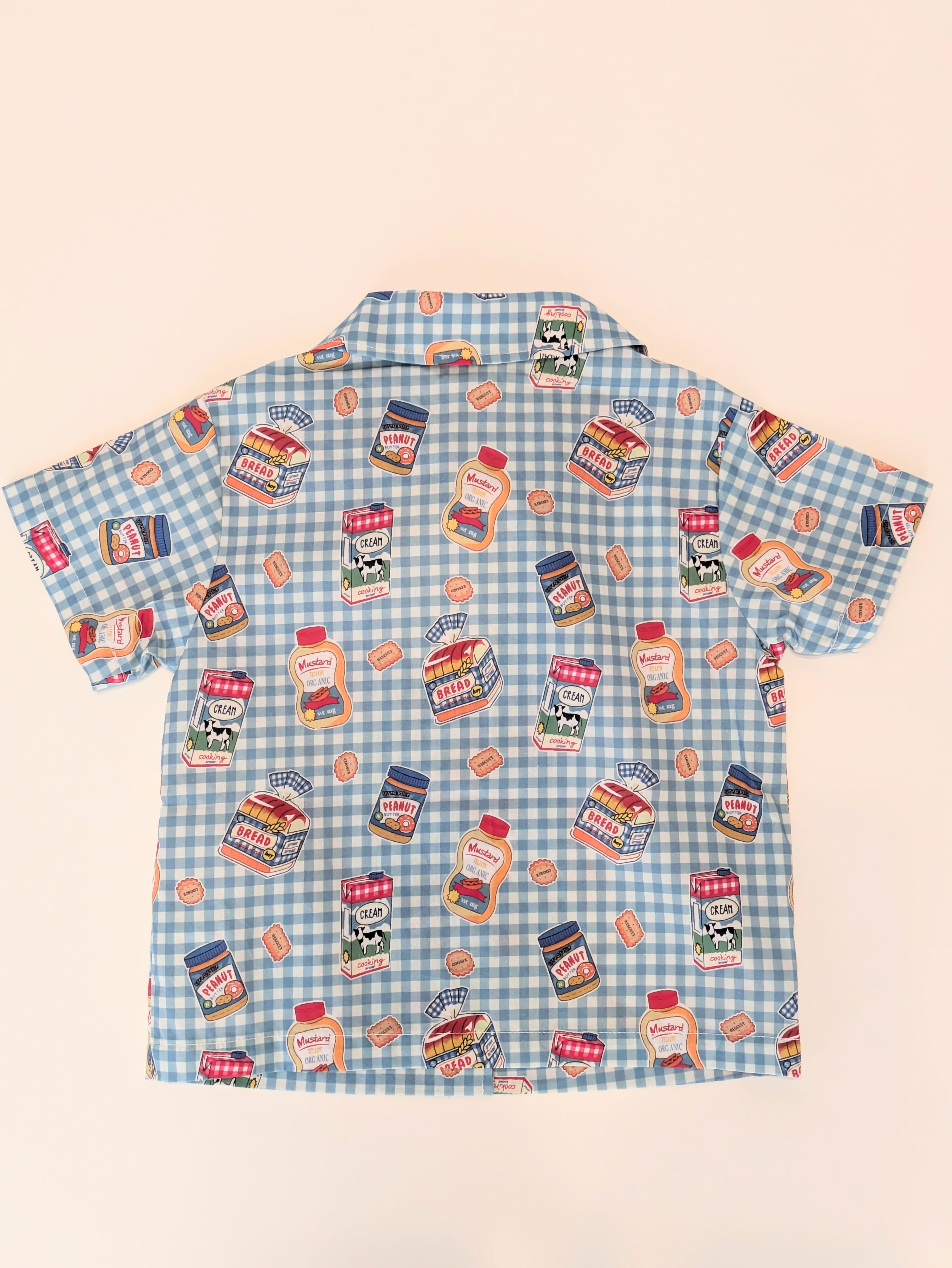 ブルーのギンガムチェックに、パンやミルク、ピーナッツバターなどの楽しいプリントが散りばめられた、遊び心たっぷりの一枚です。