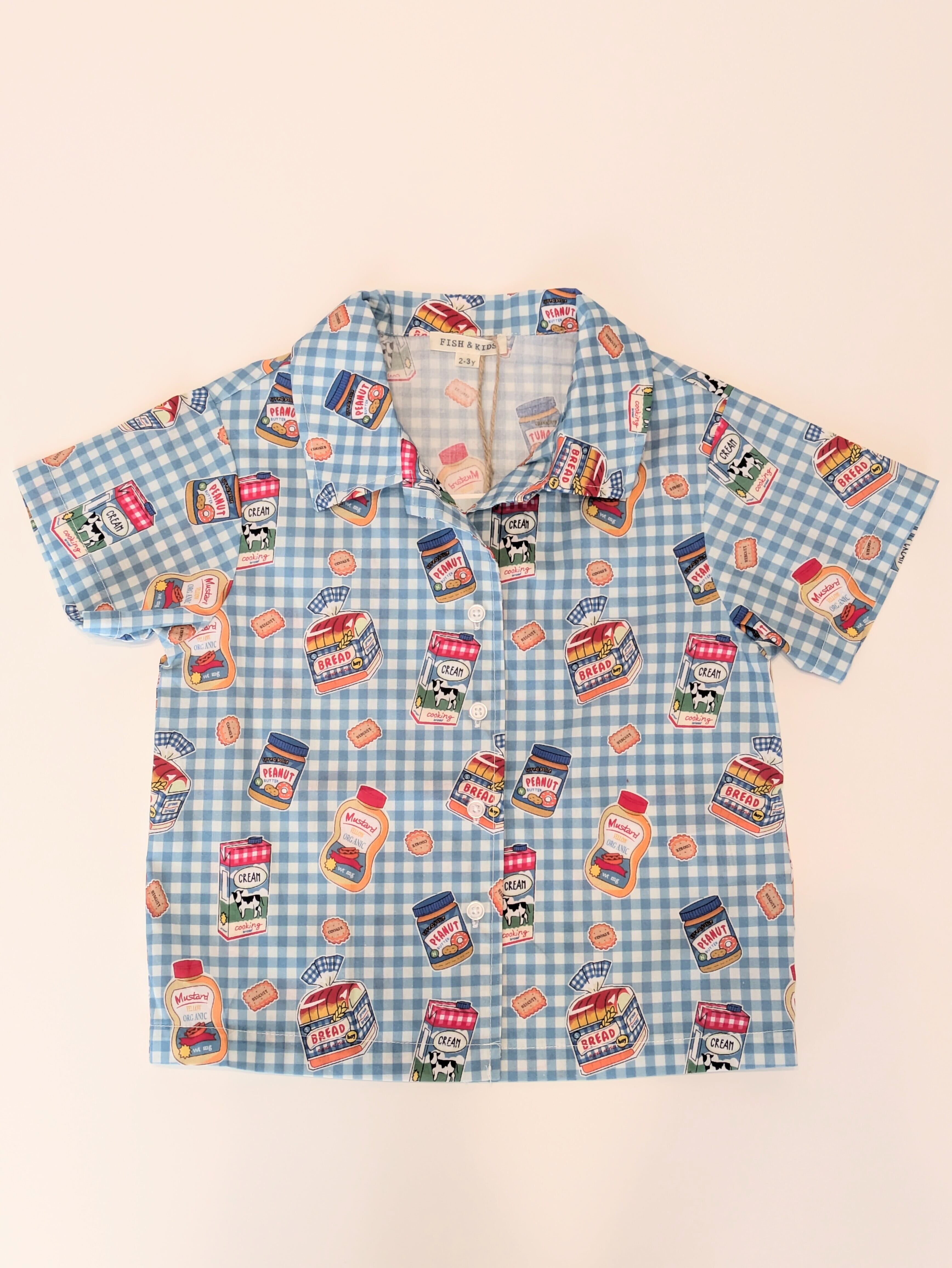 朝食モチーフのイラストがぎゅっと詰まった、FISH & KIDS SS26コレクションの半袖シャツ。