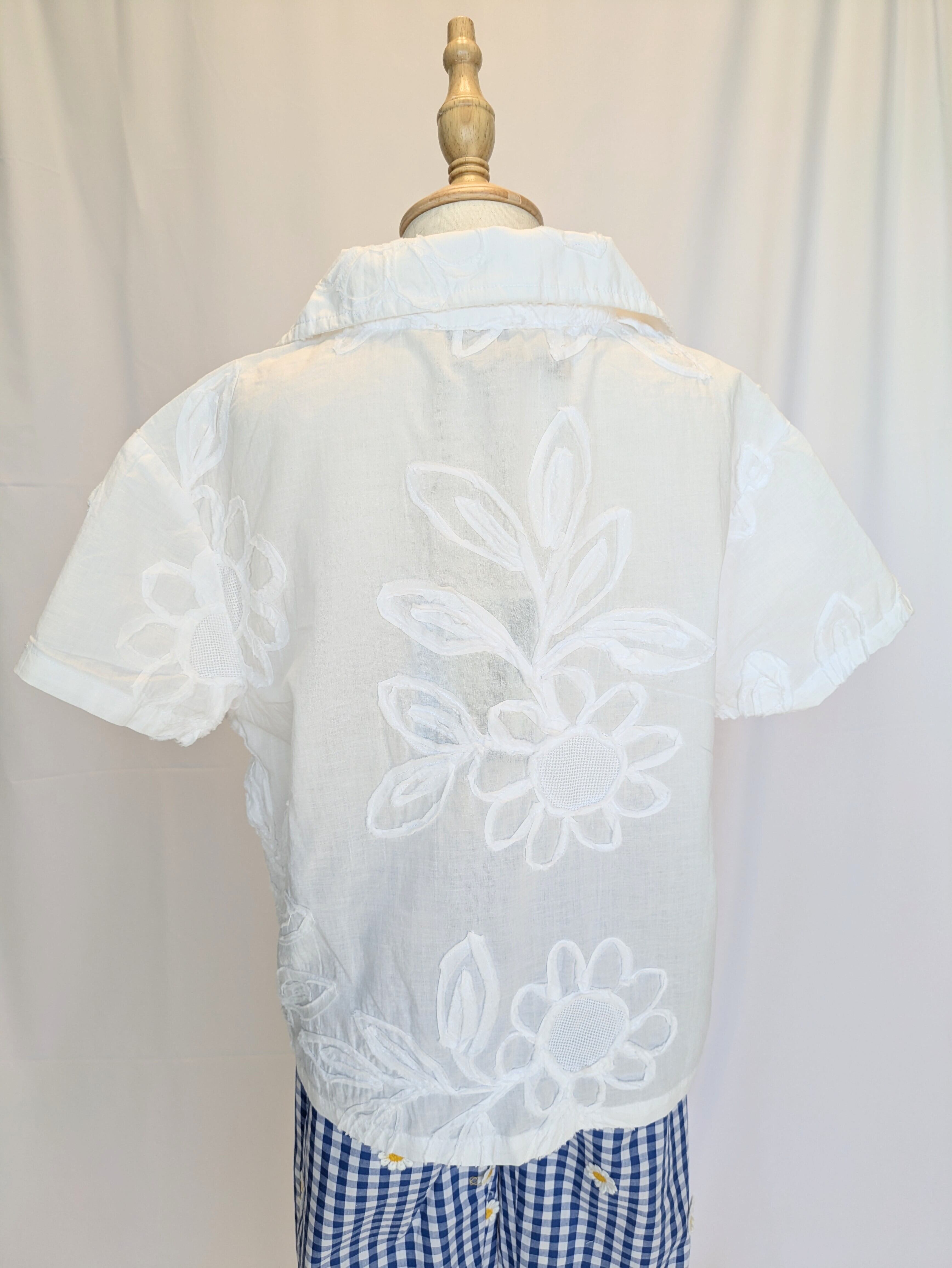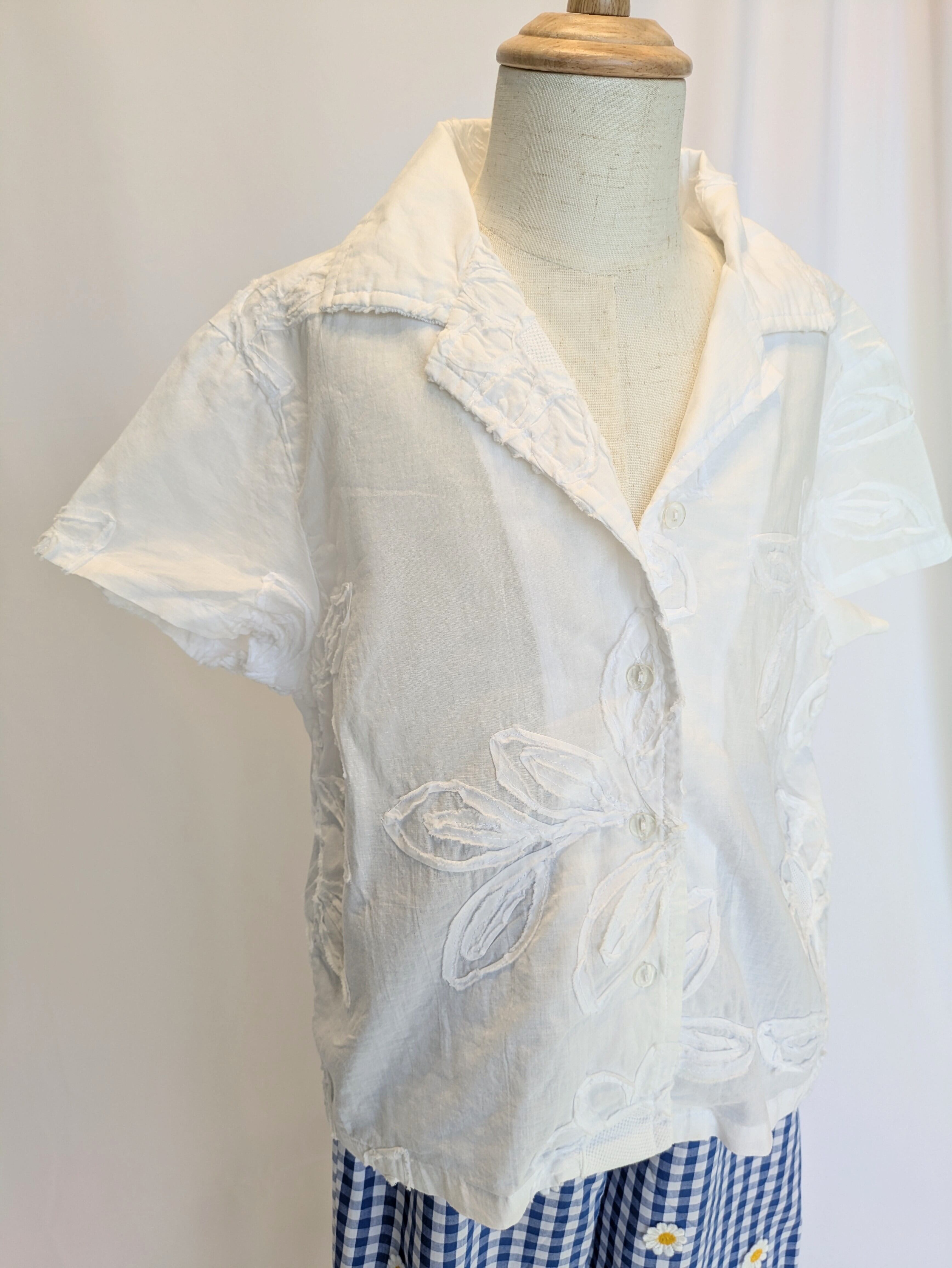 繊細なフラワー刺繍が全体に施された、FISH & KIDS SS26コレクションのホワイトシャツ。